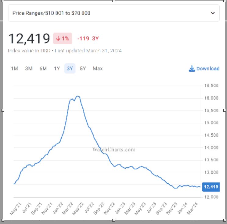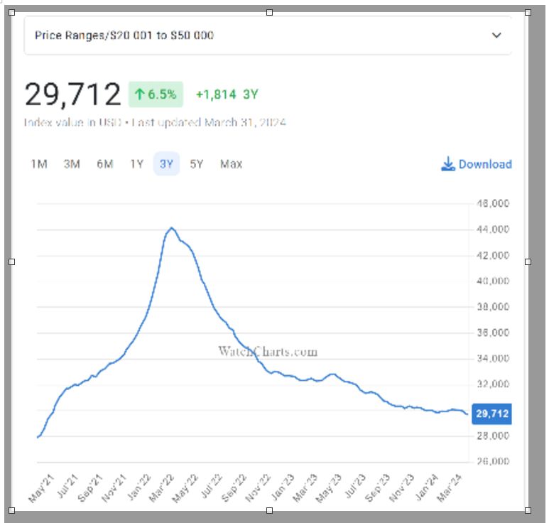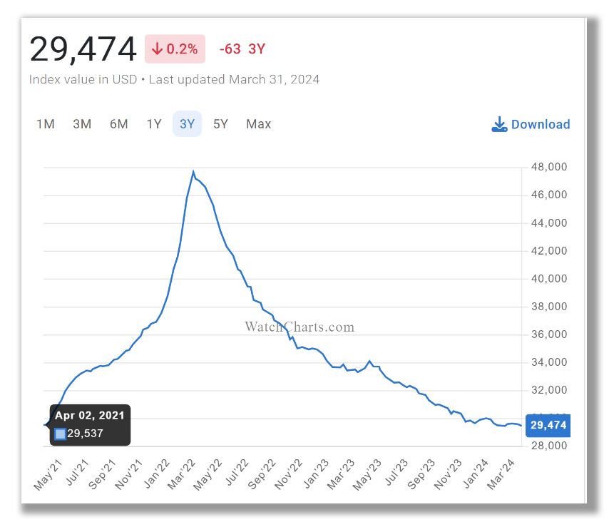 Интенсивный рост цен на вторичном рынке начался в 2020-м и совпал с началом раздачи правительствами многих стран «ковидных денег». Это привело к возникновению понятия «инвестиционные часы», масса аналитиков начала сравнивать рост цен на часы с ростом цена на акции и другие активы. И хотя весной 2022го тренд сменился на нисходящий, многие говорили, что цены на часы все равно остаются выше, чем были 2 или3 года назад. Однако в первых числах апреля индекс WatchCharts впервые опустился ниже отметки трехлетней давности: если 2 апреля 2021 года он составлял $29 537, то вчера – $29 474.