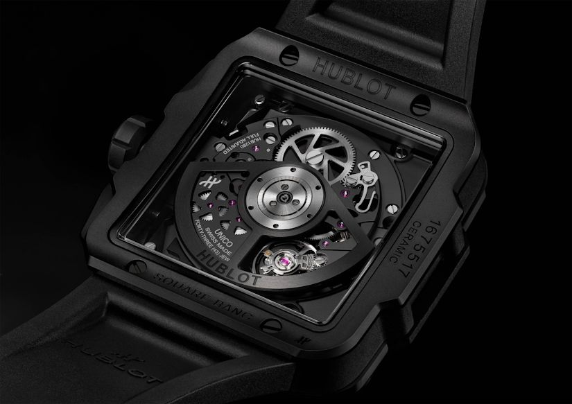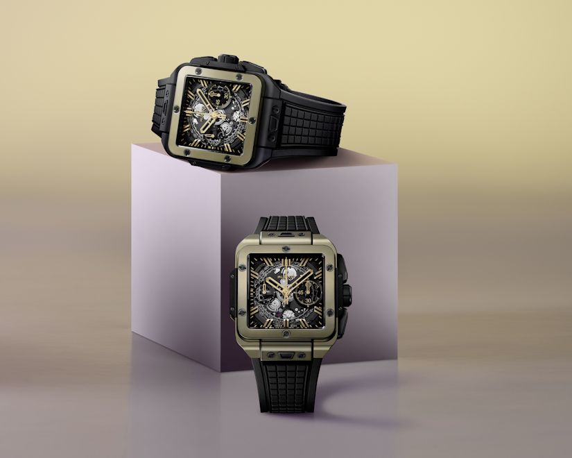 Часы Square Bang, которые дебютировали в портфолие Hublot в 2022-м, теперь представлены в версиях из золота Magic Gold (одна из версий совмещает золото с керамикой). Если до того модль представала в вариантах из легкого титана, то теперь в коллекции появились две версии часов в квадратных корпусах из устойчивого к царапинам золота.