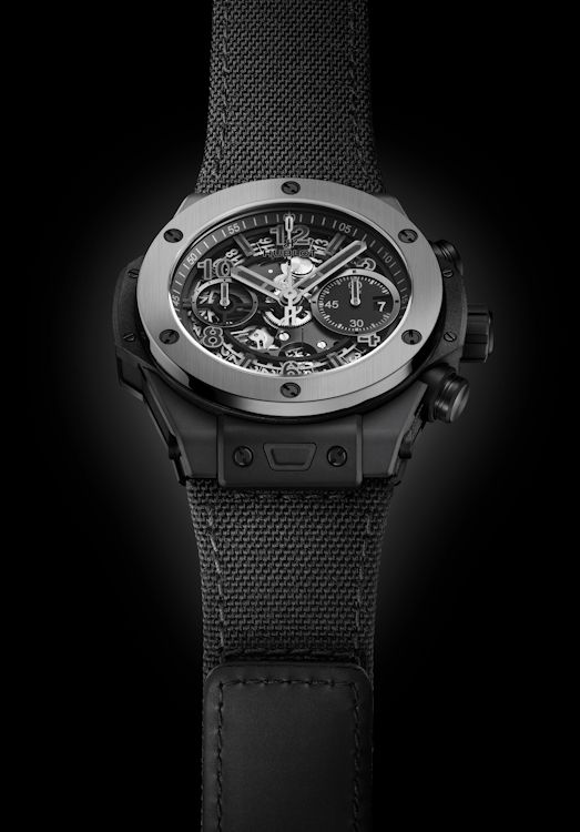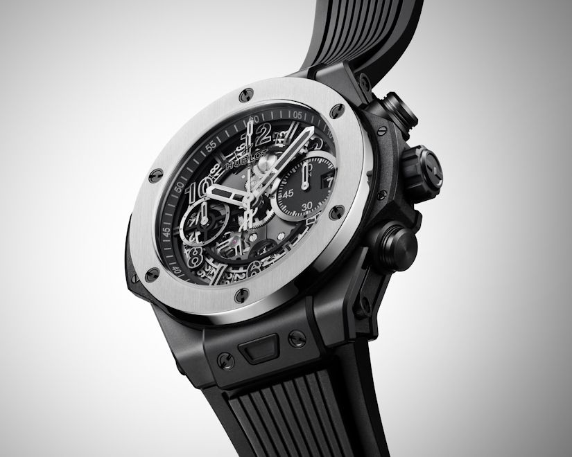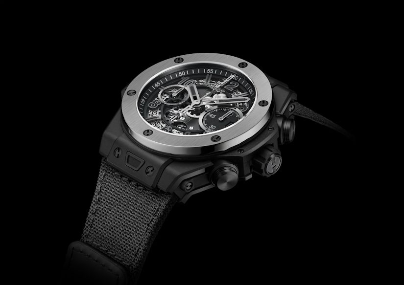 Корпус изготовлен из керамики черного цвета с микроструйной обработкой и полировкой обрамляет открытый циферблат, черех который просматриваются детали мануфактурного калибра HUB1280 (в том числе, колонное колесо т диск даты, которая появляется на секундном счетчике на отметке «3 часа»). Автоматический механизм хронографа с функцией flyback и 72-часовым запасом хода заключен в корпус диаметром 42 мм и толщиной 14,5 мм.