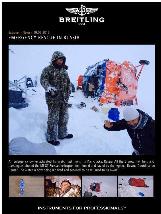 Часы Breitling спасли жизнь туриста на Камчатке — несколько лет назад после крушения вертолёта один из пассажиров активировал персональный радио-маяк часов Breitling Emergency и через некоторое время служба спасения обнаружила потерпевших. В сервисе LPI Watch club, единственном авторизованном в России для ремонта таких часов, нам рассказали об особенностях обслуживания Breitling с маячком. Всего в мире 13 таких центров, в которых есть специальное оборудование и запчасти.