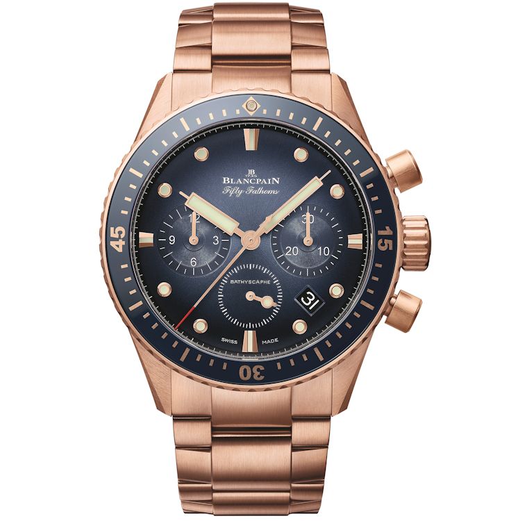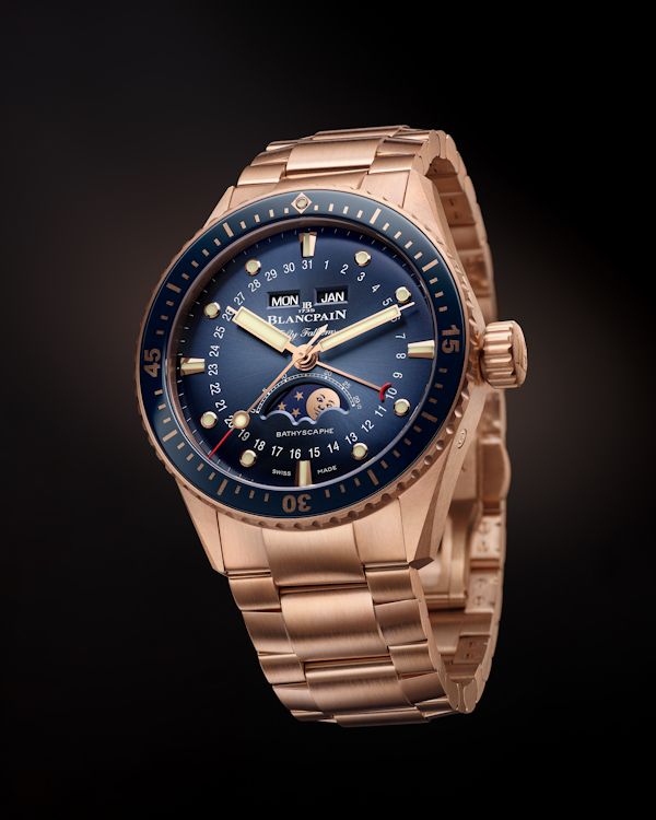 Выходцы из коллекции Fifty Fathoms от Blancpain - теперь в красном золоте и на золотом браслете с сатинированными звеньями. Новый облик получили модели Quantième Complet Phases de Lune c индикацией даты, дня недели, месяца и фаз Луны, а также хронограф Chronograph Flyback. К теплому золоту подобрали синий оттенок циферблата. Размер корпуса у обеих новинок - 43 мм.