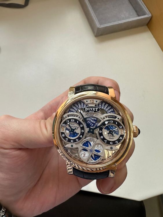 Механизм часов Bovet Recital 17 не зря назван Virtuoso II. Он умеет показывать время сразу в трех часовых поясах и имеет большой запас хода – 7 дней. Часы несколько лет прекрасно ходили, но владелец обратил внимание, что в последнее время часы начали спешить, а кнопки смены пояса стали работать как-то не так, и попросил специалистов Таймсервис проверить часы.