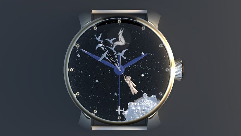 Часы посвящены герою знаменитой книги Антуана де Сент-Экзюпери. Циферблат сделан из авантюрина, который символизирует космическое небо, черно синий космический облик дополняют стальные вороненые стрелки. В окошке под циферблатом расположен тонкий сапфировый диск с семью картинами планет-астероидов. Шесть соответствуют астероидам, на которых побывал принц, седьмая – Земле, ее символизирует Лис. Там, где волею судьбы встречаются Автор и Маленький Принц. Секундную стрелку украшает самолет Антуана, а на задней крышке расположен барельеф с его портретом. Внутри часов работает механизм «Слава 2427 производства 2-го МЧЗ.