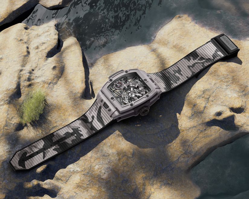 42-миллиметровый корпус модели снова выполнен из керамики теплого серого цвета с микроструйной обработкой и полировкой, созданной Hublot для SORAI, чтобы передать цвет кожи носорога, и впервые появившейся в модели Big Bang Unico SORAI 2023 года. Часы оснащены серым тканевым ремешком и имеют дополнительный каучуковый ремешок черного цвета с ярким серо-бежевым камуфляжным рисунком.
