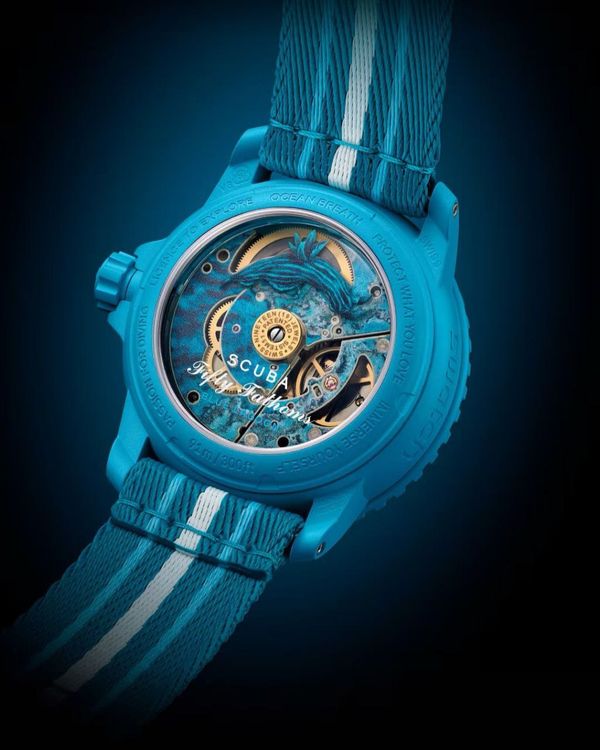 Часы коллекции впервые оснащены двухсоставным ремешком (он изготовлен из переработанных рыболовных сетей). Сообщается, что цвет вдохновлен голожаберным молюском Tambja Mullineri.