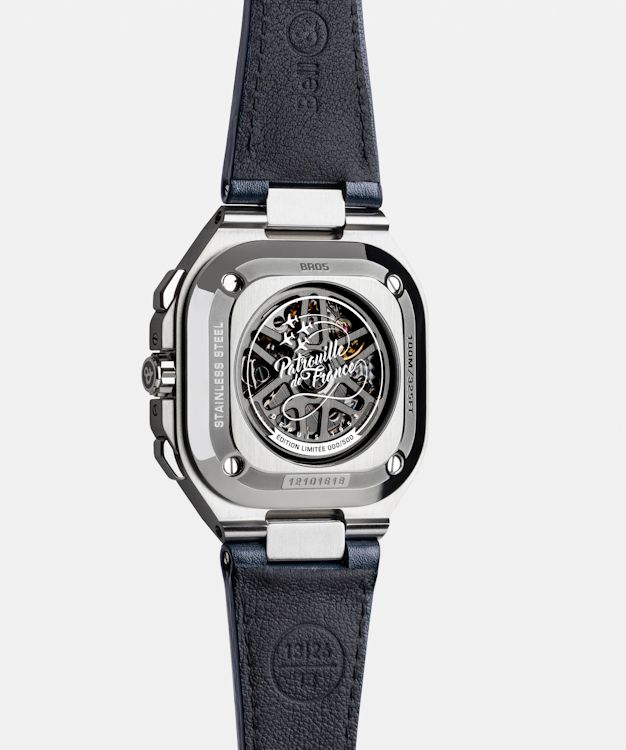 Голубые небеса от Bell & Ross в сотрудничестве с французской пилотажной группой Patrouille de France. На голубом циферблате BR-05 Chrono Patrouille de France - логотип группы, напоминающий о том, как самолёты «Альфа Джет» выпускают дым цветов французского флага.