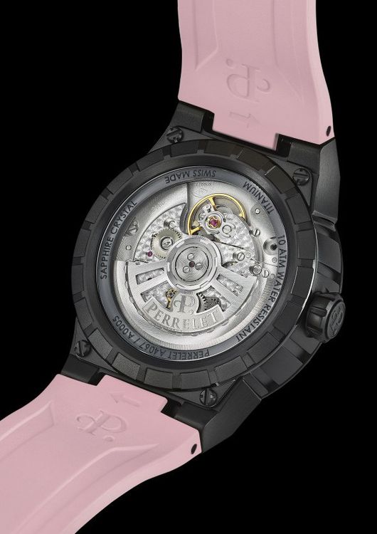 Очередная новинка в розовых тонах - Perrelet Turbine Pink Flamingo. Заявленный орнитологический тон сглаживается черной турбиной и корпусом с черным DLC-покрытием. Корпус выполнен из легкого титана, его размер - 41 х 13,9 мм (до 41 мм турбина уменьшилась только в 2023-м, до этого в коллекции были часы с габаритами от 44 до 48 мм).