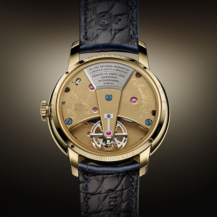 Arnold & Son выпустил 11 экземпляров модели Constant Force Tourbillon 11 в корпусе из желтого золота диаметром 41,5 мм. Часы оснащены устройством постоянной силы (видно со стороны эмалевого циферблата) и турбийоном (виден сзади).