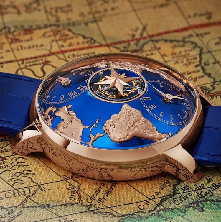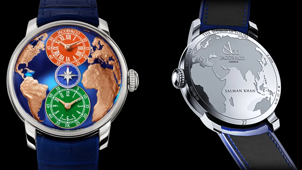 Это новейшая версия часов The World Is Yours Dual Time Zone, которая обзавелись 30-секундным турбийоном на сапфировом мосту. Изначально Jacob & Co “The World Is Yours” Dual Time Zone была создана Джейкобом Арабо (он же Яков Арабов) как дань уважения отцу Нисону, который в 13 лет подарил ему часы Wakmann с двумя часовыми зонами. “The World Is Yours” похожи на свой источник вдохновения, но, конечно, не воспроизводят его полностью.