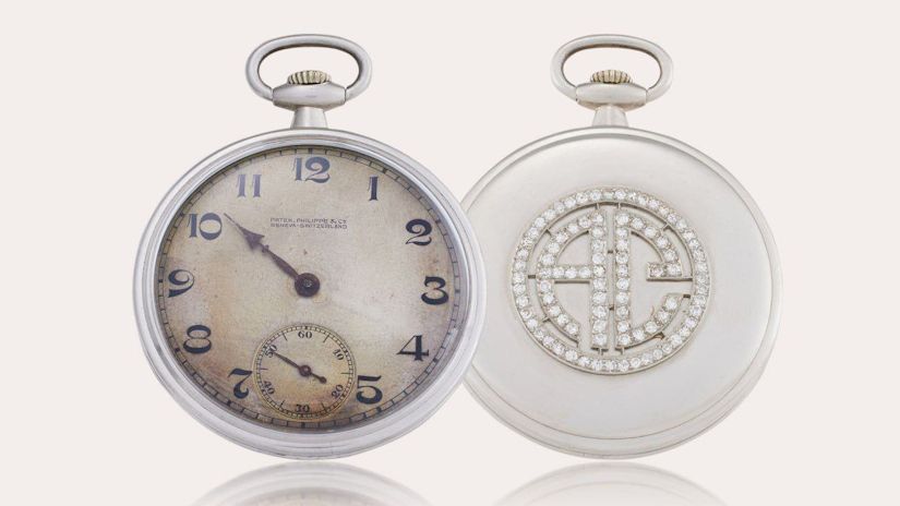 Часы Аль Капоне - карманные Patek Philippe с бриллиантами - будут проданы на аукционе Sotheby's в начале июня (предварительная оценка 80 000 - 160 000 долларов). 42-миллиметровый корпус гангстерских часов 1919 года выполнен из платины, а инициалы бывшего владельца выложены 90 бриллиантами. Со стороны циферблата часы выглядят более печально, вековой возраст заметен, а минутная стрелка и вовсе пропала (обстоятельства неизвестны, но с учётом личности владельца для себя можно придумать самые захватывающие объяснения).