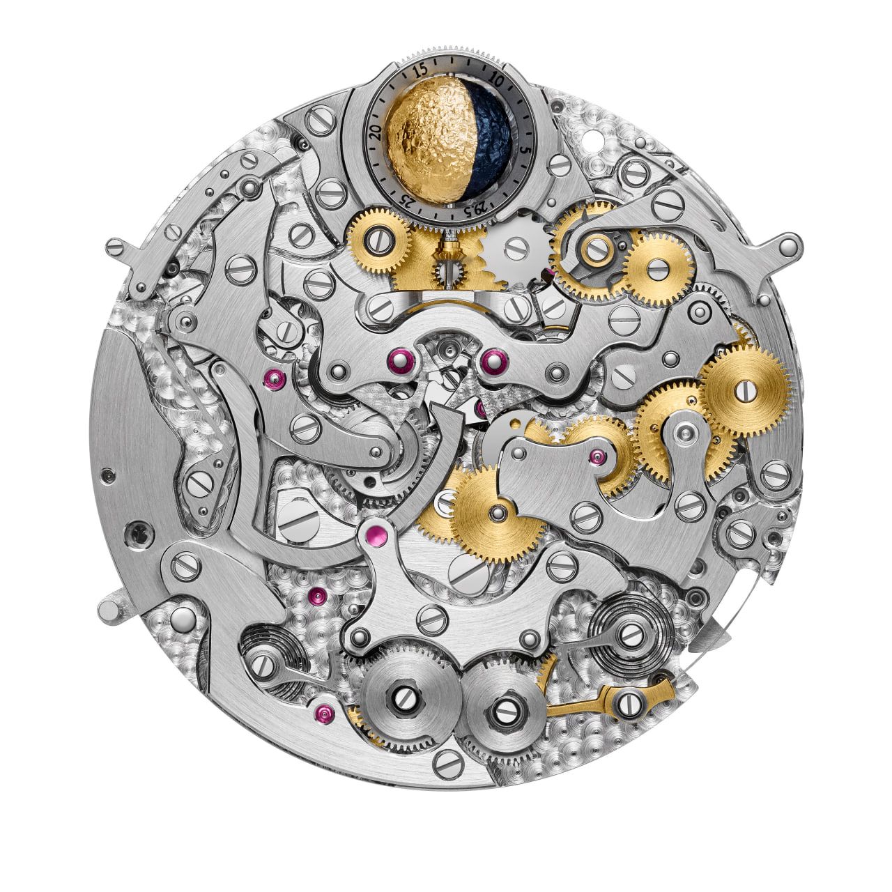 Задний фон - небо в Женеве в день основания в 1755-м. Тут же двойной ретроградный индикатор запаса хода и индикатор фаз Луны с указанием возраста.