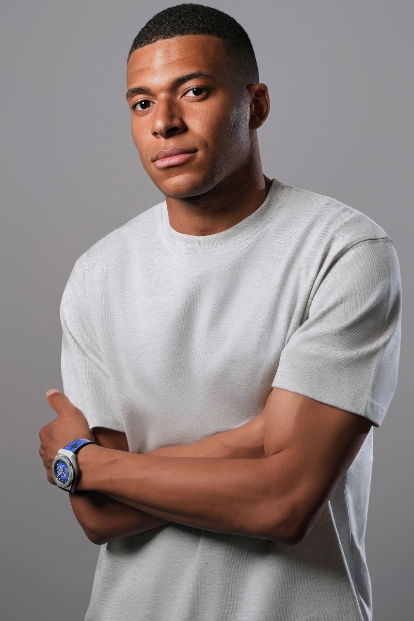 Ремешок из черного каучука и синей телячьей кожи также декорирован культовой эмблемой Лиги чемпионов УЕФА — футбольным мячом из звезд.