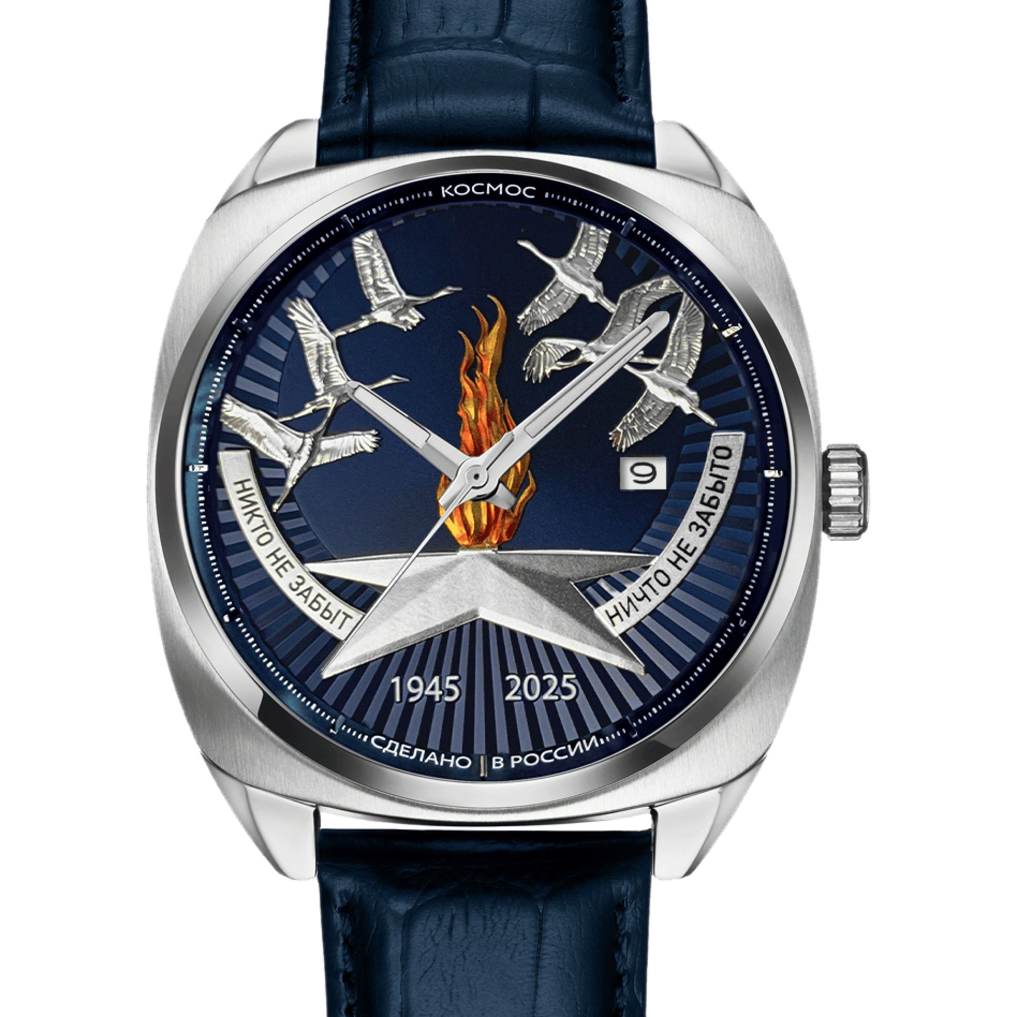 - «Космос» представлен в номинации часами из ограниченной серии к 80-летию Победы. Оранжевые и красные оттенки Вечного огня создают ощущение живого пламени. Журавли —отсылка к солдатам, не вернувшимся с войны. А на задней крышке – список городов-героев и монумент воину-освободителю в Трептов-парке в Берлине;