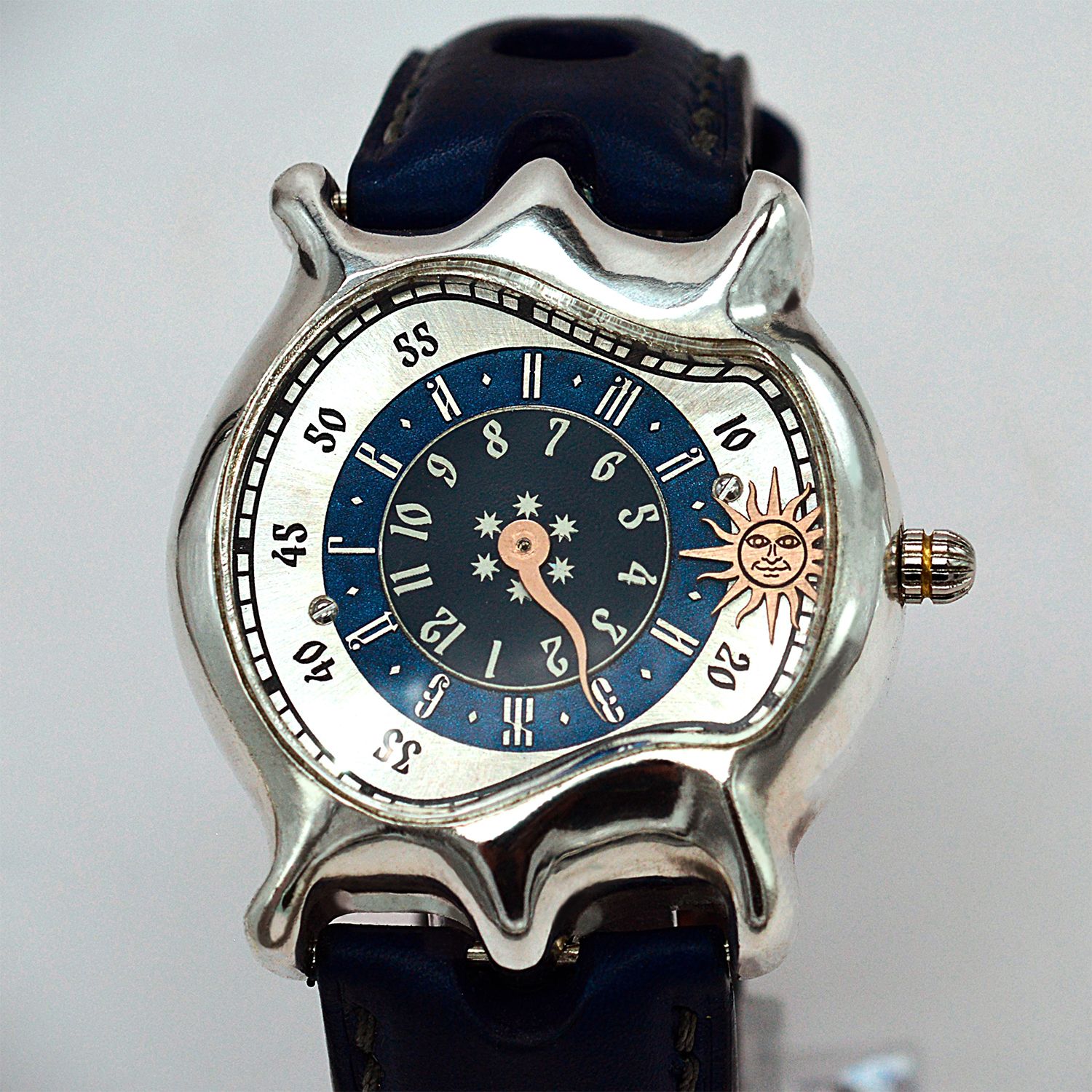 - Руслан Скютте создал свою новинку по образу знаменитых исторических часов, расположенных на башне Нижегородского Кремля, созданных в XVI веке. Оригинальный асимметричный корпус и циферблат выполнены из серебра (вес корпуса — 80 г), минутная стрелка и солнце - из золота 585 пробы;