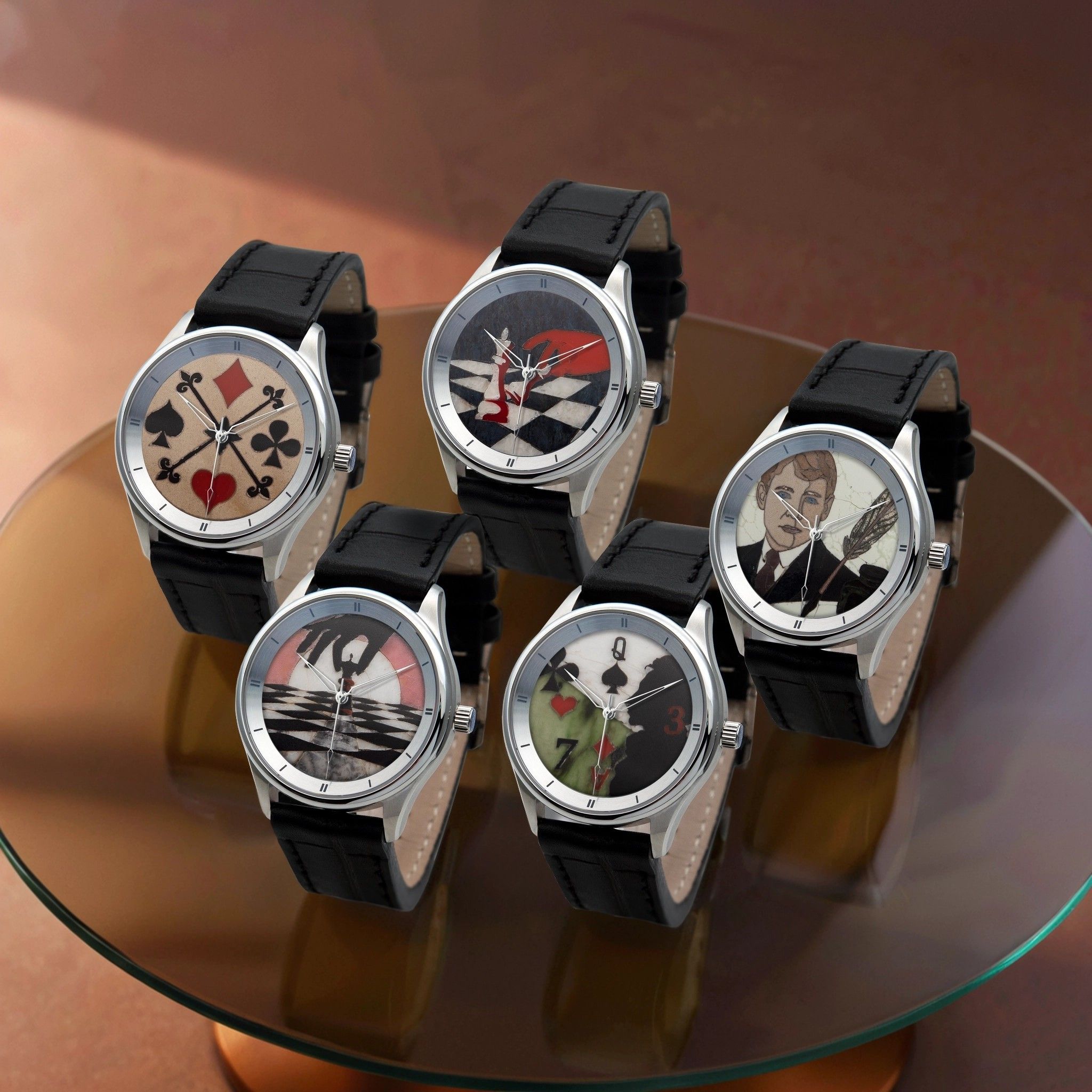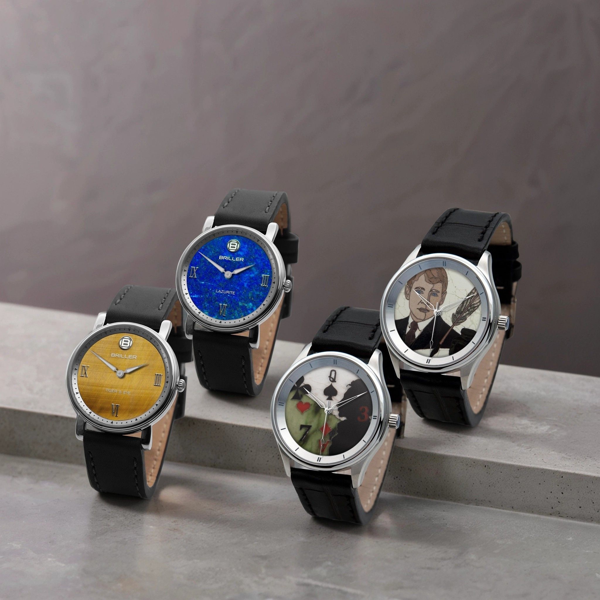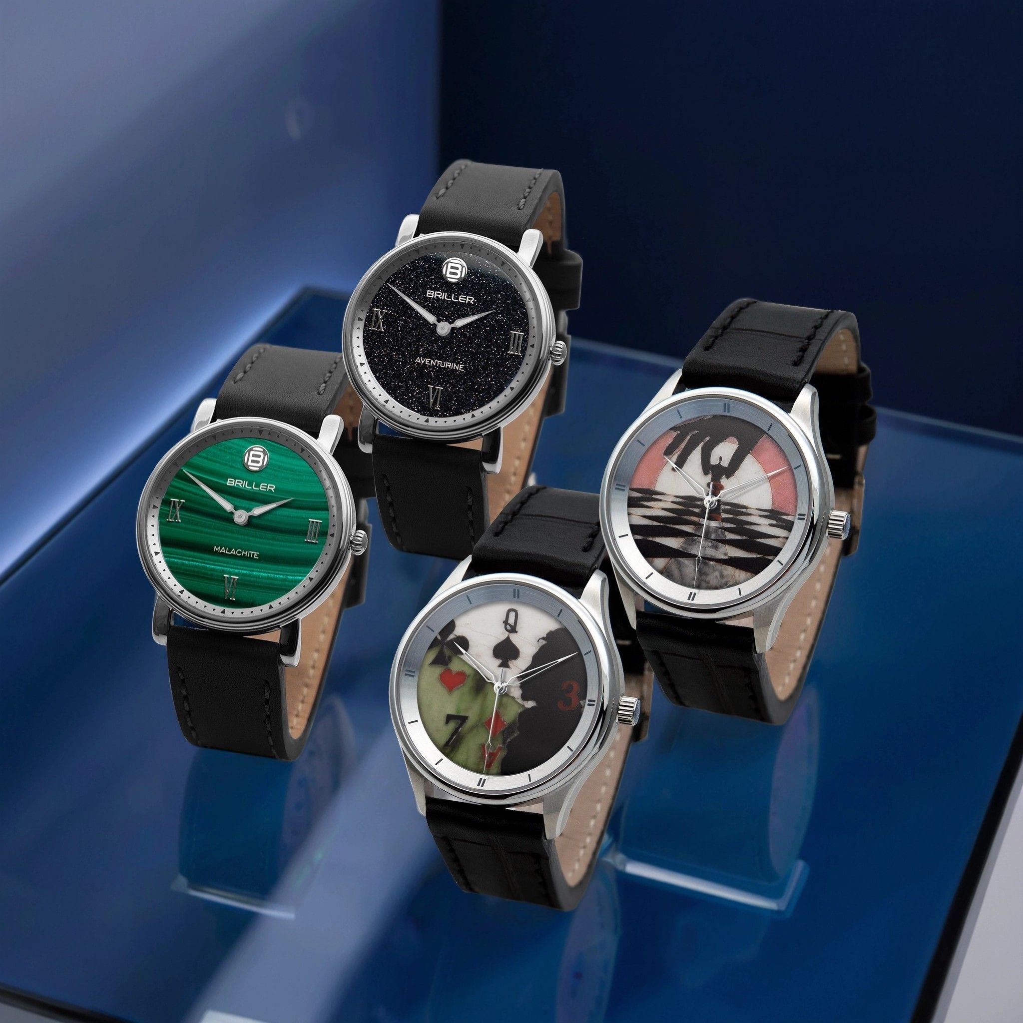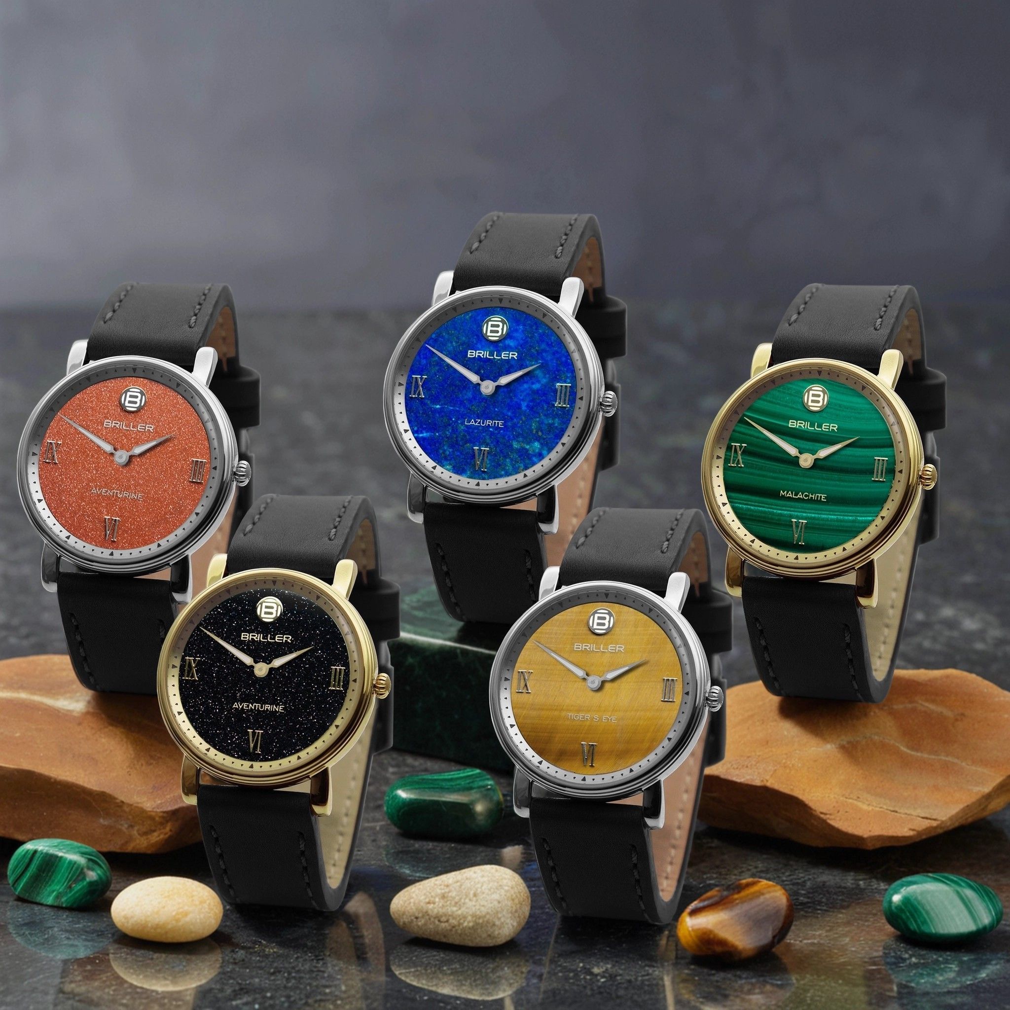 Главное украшение коллекции — циферблаты из природных минералов. Глубокий зелёный малахит, мерцающий тигровый глаз, небесно-синий лазурит и авантюриновое стекло в двух оттенках — строгом чёрном и выразительном красном.