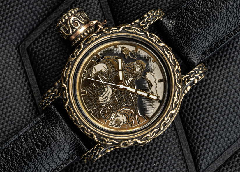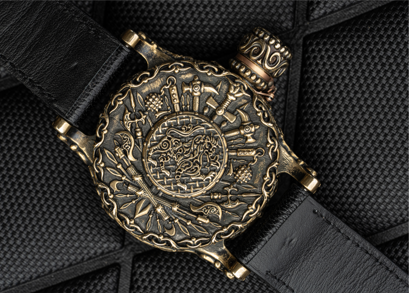 Литые часы от ЗЧЗ – это настоящая скульптура из металла, каждая деталь которой выплавляется в огне, сохраняя при этом тончайшие линии орнамента и создавая сложный рельеф узора. Так умеют только в Златоусте, городе с многовековыми традициями украшения холодного оружия. А миниатюрная, тоже фирменная златоустовская гравюра превращает в произведение искусства и циферблат. На котором вручную вырезан суровый богатырь, былинный воин и защитник, олицетворяющий одновременно и силу русской легенды, и мастерство уральской художественной школы гравюры на стали.