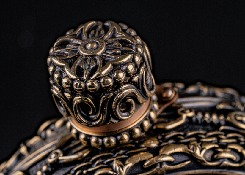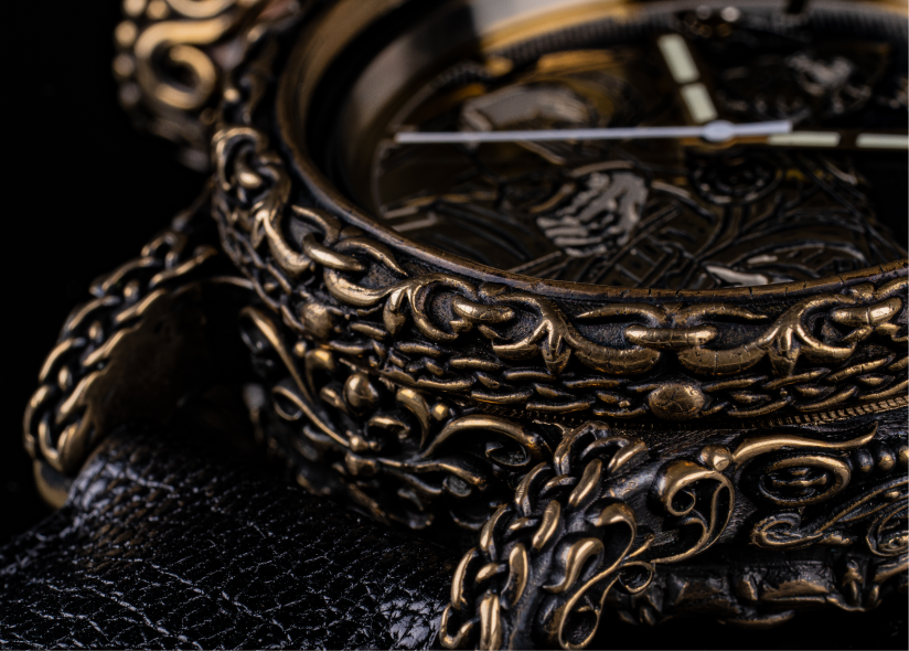 Литые корпуса часов – дело не быстрое: сначала делается 3D-модель, затем – модель из пластика, и только после всех проверок и допусков, начинается работа с металлом. Для самой первой модели часов «Русский богатырь» была выбрана латунь, коррозионно-устойчивый, пластичный металл, позволяющий работать со сложнейшими текстурами и узорами, и придающий готовому изделию насыщенно-яркий золотистый цвет.