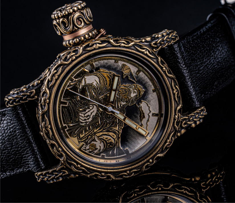 Постепенно образ Ильи Муромца был существенно трансформирован местными мастерами: исчез конь, булаву заменили на меч, с рук сняли боевые рукавицы, а вот шикарную бороду, символ мужской силы и гордости, не тронули. А еще, внезапно стало понятно, что к такому яркому и во всех смыслах мощному циферблату требуется нестандартный корпус.