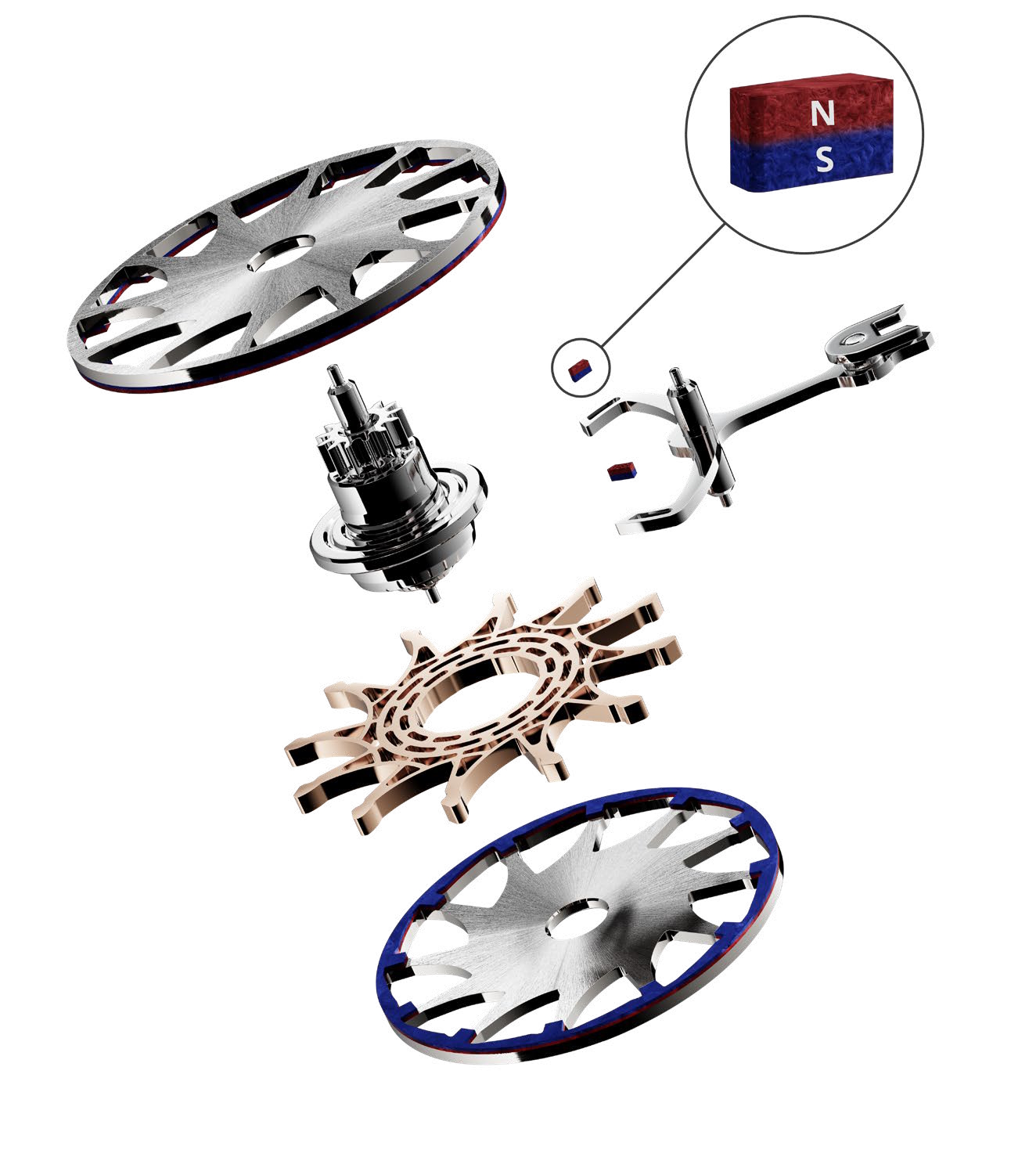 Колесо тут трехуровневое: верхняя и нижняя части (также с магнитами) выполнены из титана. А посередине - стопорное колесо, которое защищает механизм от нежелательных скачков.