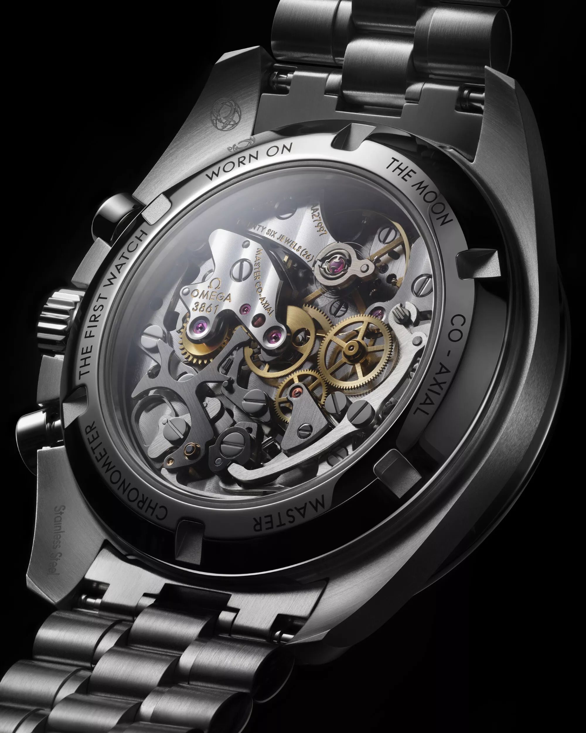 За прозрачной задней крышкой - калибр 3861 с коаксиальным спуском и сертификатом Master Chronometer. Запас хода механизма с ручным заводом составляет 50 часов.