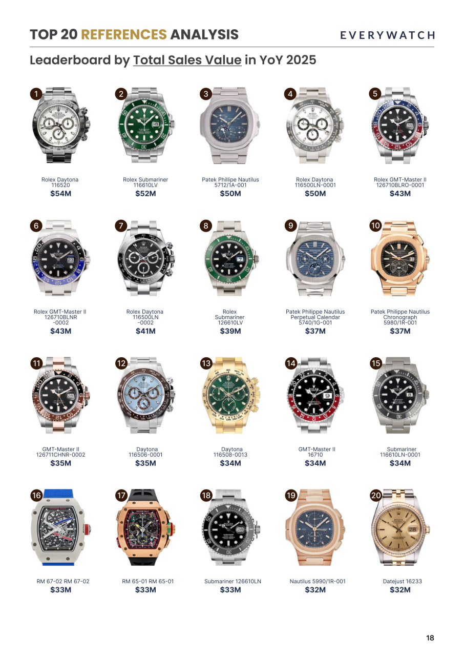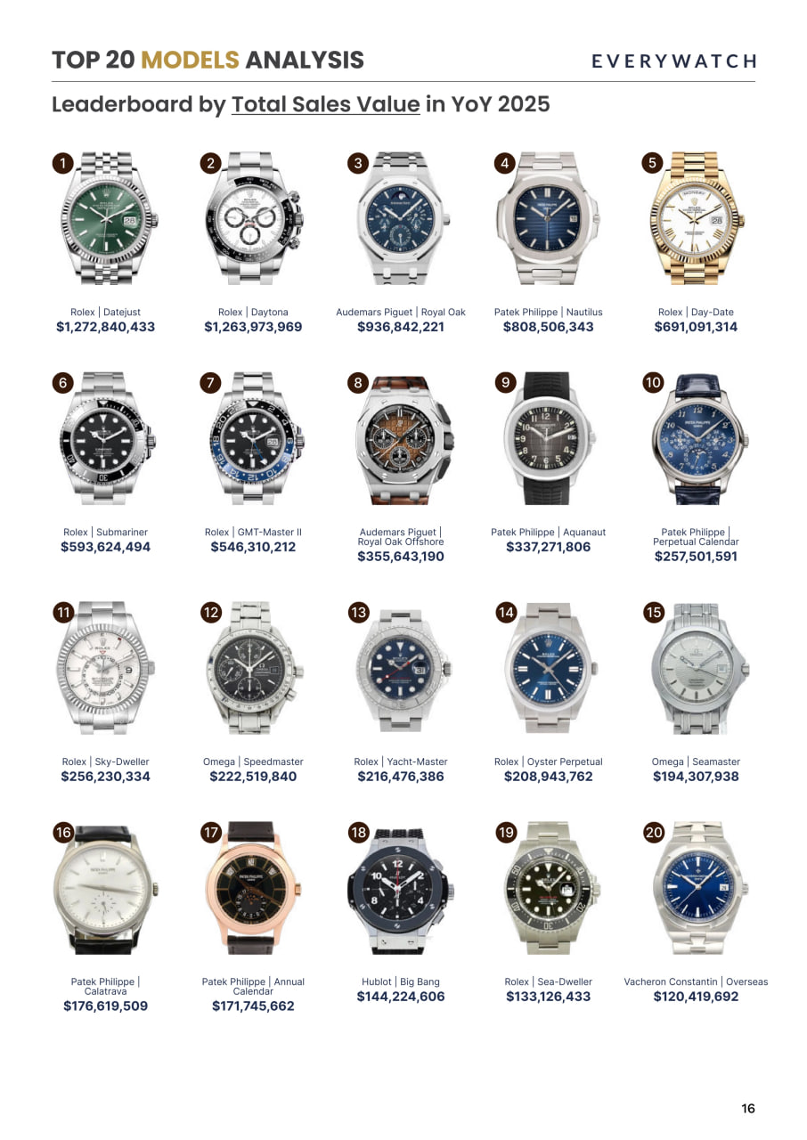 В EveryWatch также выделили модели с наибольшим объемом продаж в 2025-м. На верхних позициях Rolex Datejust (1,28 миллиарда долларов) и Rolex Daytona (1,27 миллиарда долларов). Совокупный объем сделок составил более 2,5 миллиардов долларов. Потом идет классика спортивного люкса с интегрированными браслетами - Audemars Piguet Royal Oak (949 миллионов долларов) и Patek Philippe Nautilus (817 миллионов долларов).