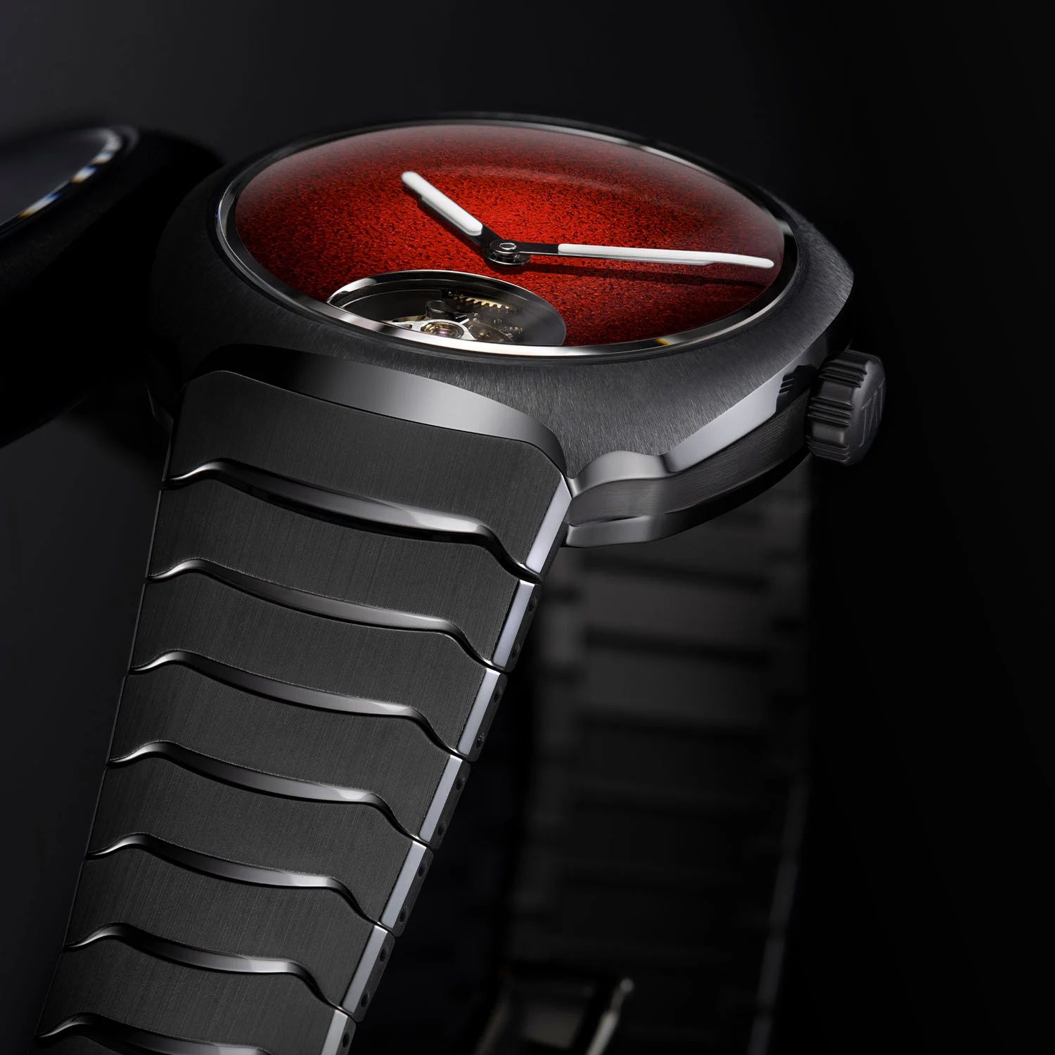 Серый корпус «подушка» обрамляет яркий красный циферблат, покрытый эмалью Grand Feu.