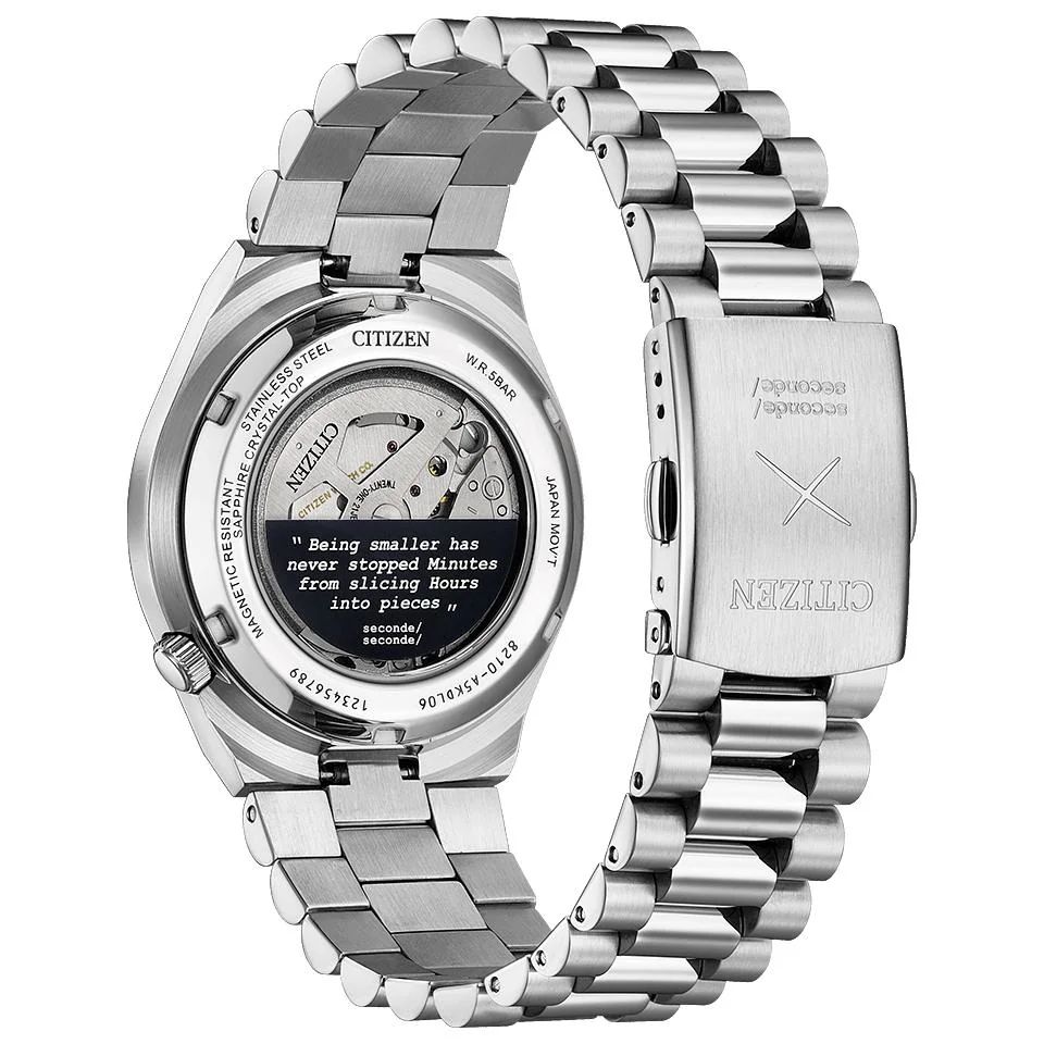 Если перевернуть корпус из нержавеющей стали размером 40 x 11,7 x 49 мм, виден калибр 8210 и надпись, остроумно объясняющая, что сделала с индексами минутная стрелка в виде меча-катаны: “То, что минуты меньше, никогда не мешало им рубить часы на кусочки”.