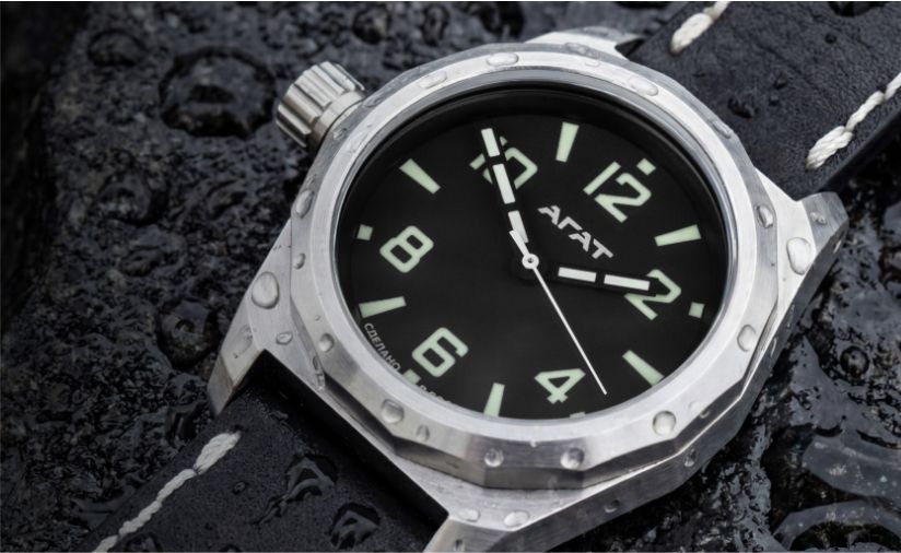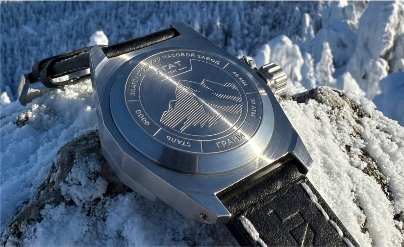 Так появились «Грани», часы новые и исторические одновременно. В современном прочтении корпус диаметром 46 мм (традиционным для Златоуста) выполнен из нержавеющей стали. По сравнению с классическими водолазными моделями завода он стал легче примерно на 40 граммов и получил более плоский профиль, благодаря чему часы заметно комфортнее садятся на запястье.
