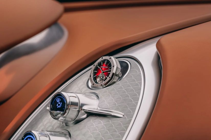 На панели эксклюзивного авто оказались часы Audemars Piguet Royal Oak Flying Tourbillon с градиентным красным (и переходящим в черный) циферблатом в палитре кузова. Часы установлены в виндер, так что о заводе переживать не приходится - этим занимается сам автомобиль.