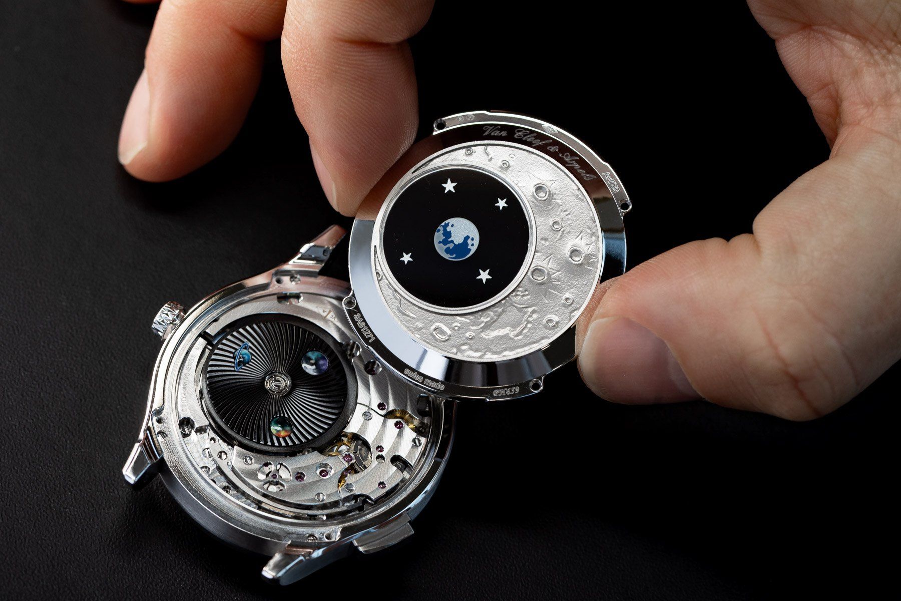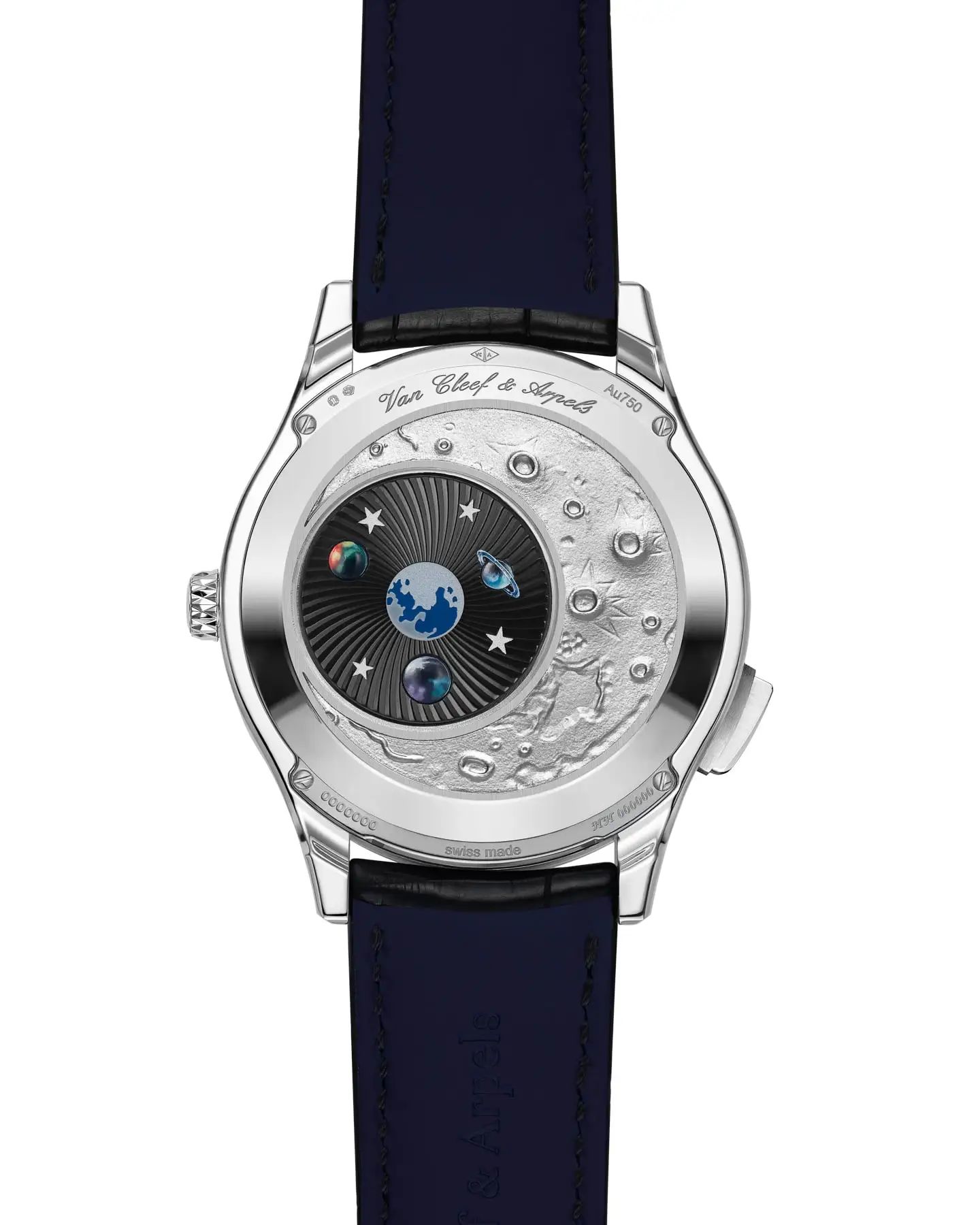 Задняя крышка из белого золота украшена гравировкой, воспроизводящей поверхность Луны. Часы оснащены механизмом с круглым ротором, дополненным изображениями планет.