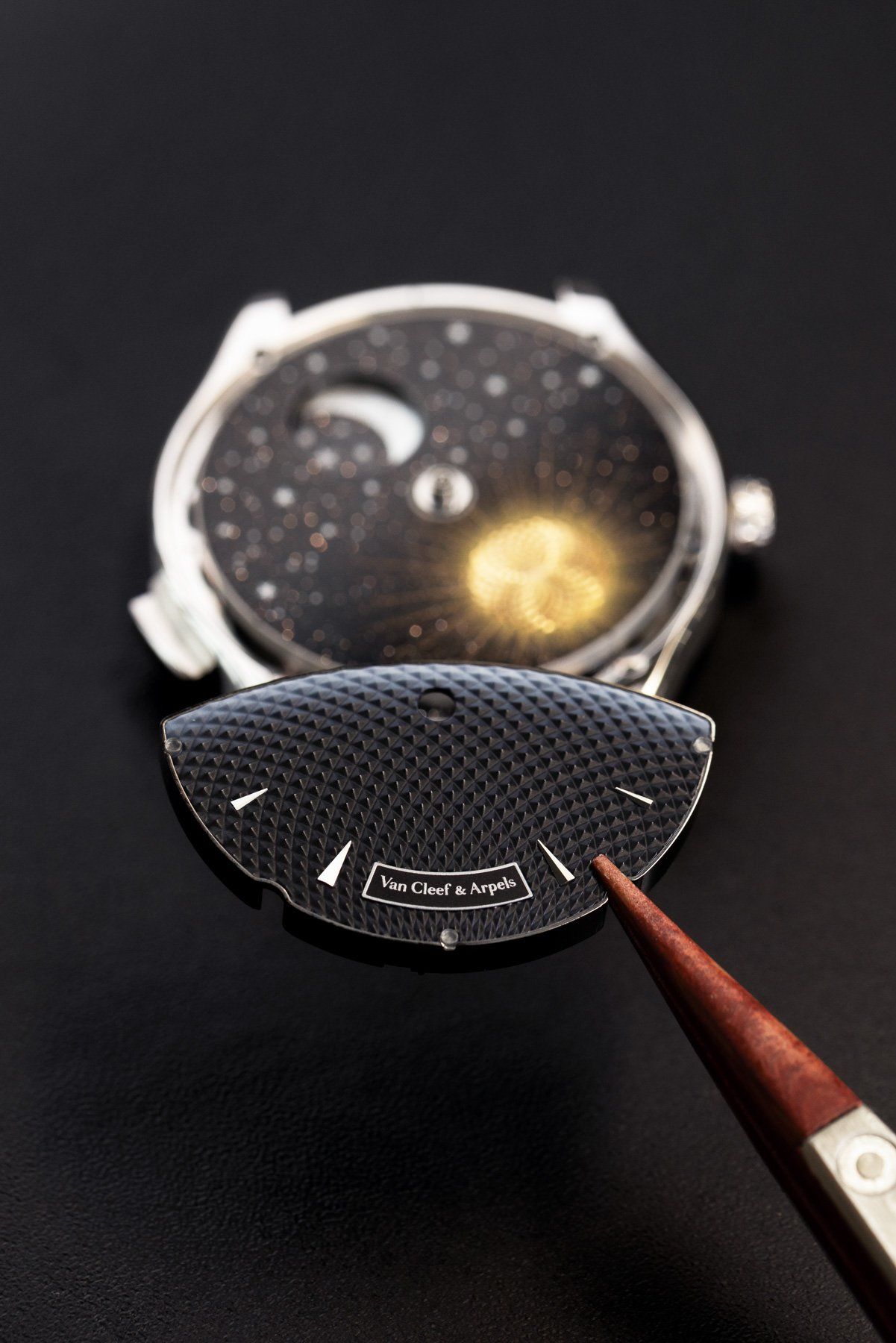 Черный циферблат выполнен муранского авантюринового стекла, разработанного в отделе инноваций ювелирно-часового дома. Участников на сцене здесь двое: золотое Солнце с гильоше и Луна из перламутра.