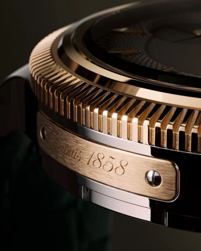 Нет заводной головки и у новинки-2026, и завод, и корректировка времени осуществляется при помощи ободка с насечками (из розового золота). Изменением режима руководит переключатель на "3".