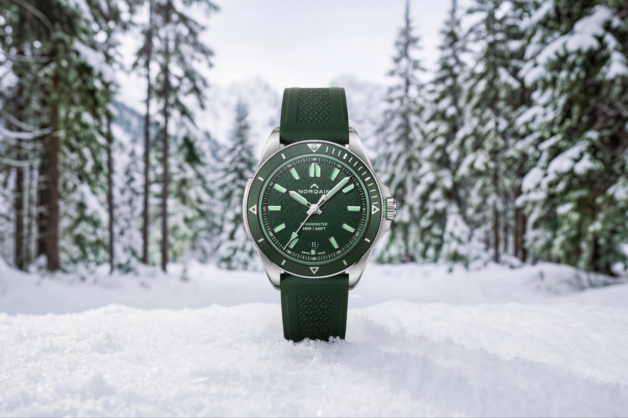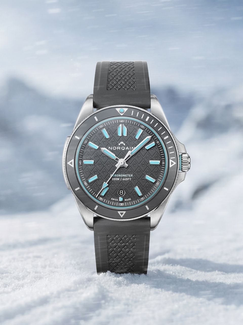Модель представлена с серым и зеленым циферблатом на каучуке нужного оттенка. Под цвет циферблата - алюминиевая вставка на ободке. Высота корпуса - 12,55 мм, водонепроницаемость - 200 м. Внутри - Norqain N08 на базе SW 200-1 с сертификатом COSC и запасом хода 41 час.