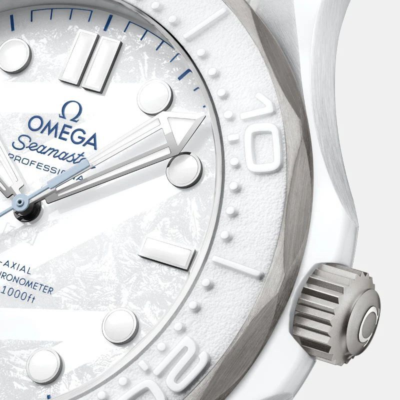 Очередные олимпийские часы Seamaster Diver 300m Milano Cortina 2026 (до этого мы видели Omega Seamaster Milano Cortina 2026 в ретро-стиле) получили циферблат из белой керамики с эффектом инея, ободок и корпус из белой керамики и титана (размер 43,50 х 14,37 мм, водонепроницаемость 300 м).