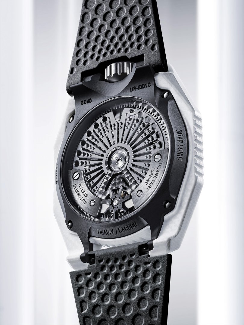 Задняя крышка из титана с DLC-покрытием открывает полный обзор ротора в форме Солнца. Внутри автоматический калибр UR 12.02 с запасом хода 48 часов.