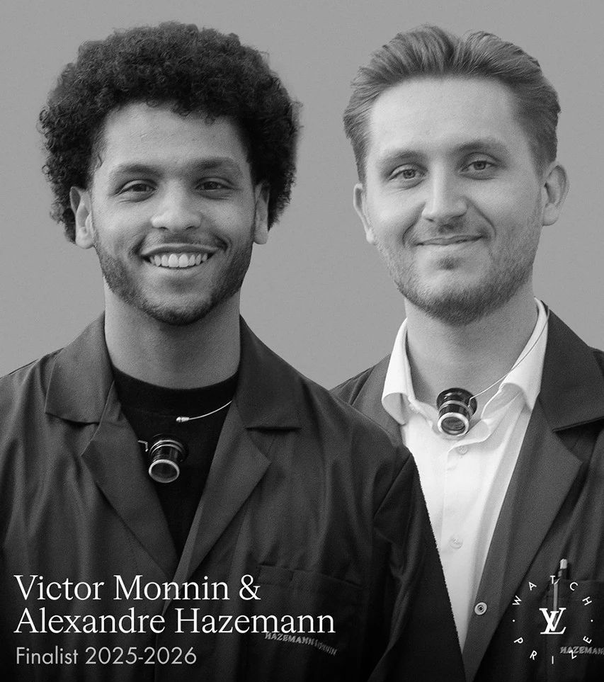Победители Louis Vuitton Watch Prize for Independent Creatives - Виктор Моннен и Александр Хаземанн (Victor Monnin и Alexandre Hazemann) с проектом School Watch, посвященным школе часового искусства Морто, где будущие часовщики и познакомились.