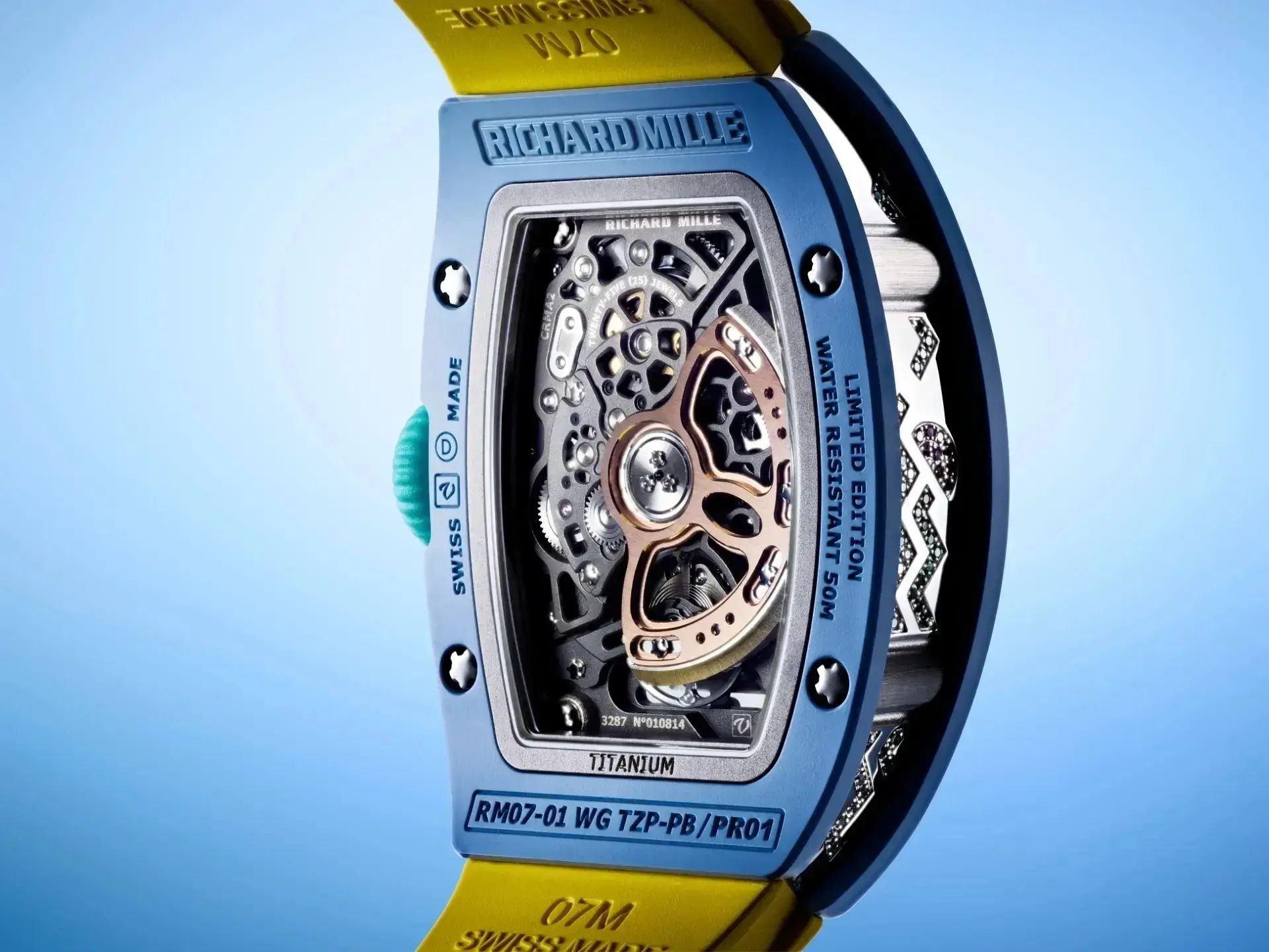 Корпусное кольцо из золота тоже дополнено драгоценными камнями. У каждой из версий - своими. RM 07-01 Blush Pink объединяет бриллианты и желтые и синие сапфиры, RM 07-01 Powder Blue – бриллианты, розовые сапфиры и цавориты, RM 07-01 Lavender Pink - бриллианты, оранжевые сапфиры и рубины. За неординарный микс материалов в корпусе 31,40 x 45,23 x 11,85 мм просят 363 000 долларов.
