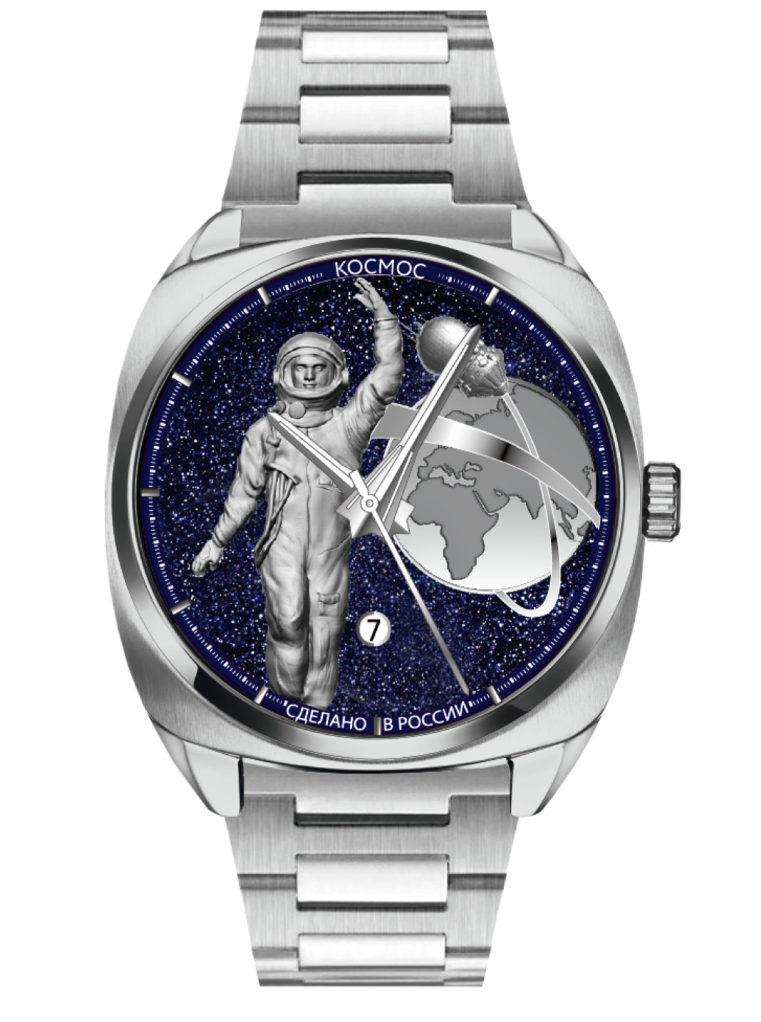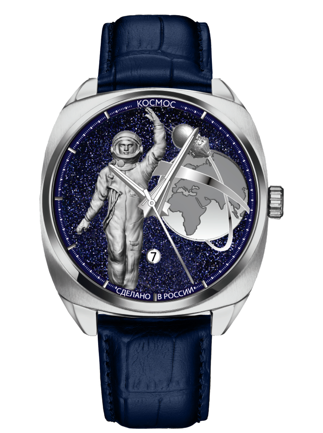 Лимитированная серия часов «65 лет в космосе» сразу привлекает внимание неординарным циферблатом. На пластине из сияющего звездами авантюрина закреплены объемные фигуры: космонавт и наша планета, изрезанная линиями материков, вокруг которой движется объект, напоминающий советский сферический спускаемый аппарат, часть корабля серии «Восток». Циферблат защищает сапфировое стекло.