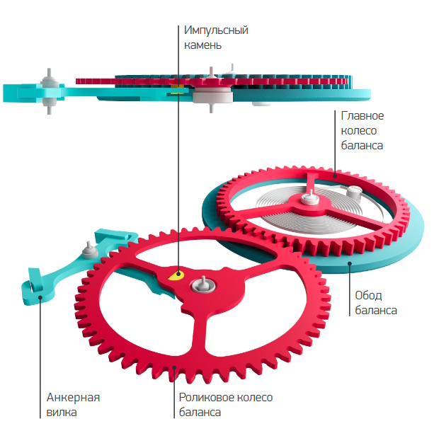 Еще одно изобретение - двойной баланс. Первый баланс взаимодействует с анкером, а на второй баланс устанавливается спираль — в этом суть изобретения мастера. При этом уровни импульсного камня и предохранительного устройства допустимо максимально сблизить, так как там нет мобильных деталей. «Колёсная передача выстроена исключительно в двух уровнях, платина механизма — это корпус часов, а колёса, как обычно, устанавливаются под мостами. Я не стал экспериментировать с установкой колёс без мостов на шарикоподшипниках, как это делалось в ультратонких механизмах, разработанных в 1970-е для фирмы Jean Lassale швейцарским часовщиком Пьером Матисом, поскольку такая конструкция по результатам практического использования его калибров не показала достаточной надёжности — от неё отказались все бренды, поначалу решившиеся на этот эксперимент»,- говорит мастер.
