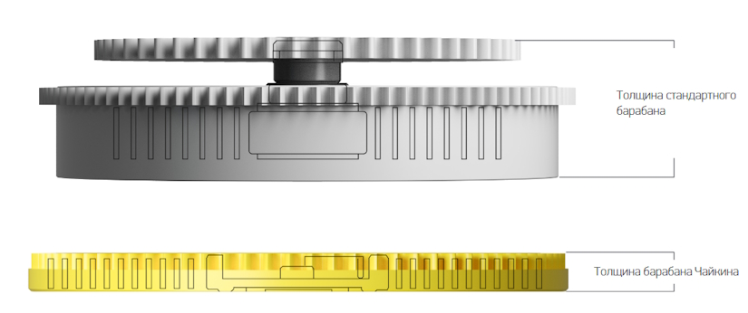 Чайкин переосмыслил заводной барабан, создав конструкцию барабана без крышки, с защёлкой и пружиной, встроенными в вал барабана: «Изучив прекрасную конструкцию Richard Mille RM UP-01, я понял, что можно вообще отказаться от барабанного колеса и крышки барабана. То, что получилось в результате — наш «шедевральный шедевр»: у барабана нет крышек, и при этом всё стабильно работает. Заводная часть с храповиком интегрирована внутрь барабана, что даёт возможность поставить хорошую пружину в корпус феноменально малой толщины. Для барабана мы сточили до нужной толщины готовую пружину и получили вполне разумный для часов с автоматическим заводом 32-часовой запас хода».