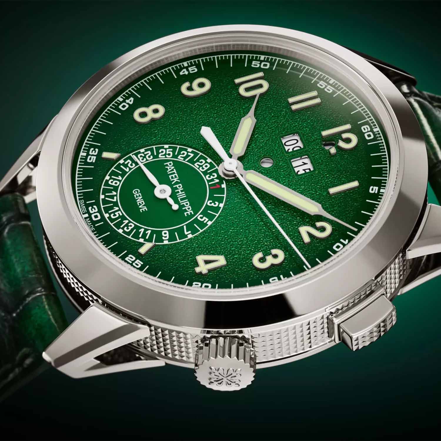 Patek Philippe 5322G-010 Calatrava с будильником - одна из весенних новинок с весенним характером (за него отвечает текстурированный покрытый лаком зеленый циферблат с градиентом). В коллекции новинка займет место дебютировавших в 2019-м ref. 5520 Alarm Travel Time.
